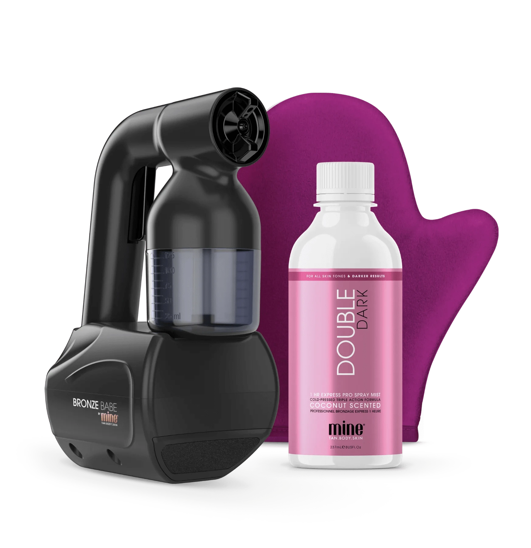 Fill the spray tan cup with 50ml of the Mine Pro Spray Mist included in your kit. That should be enough to spray your entire body!